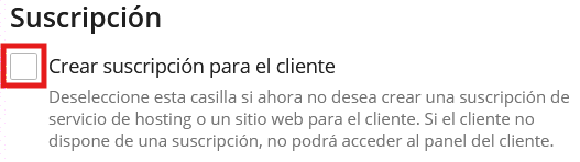Nota: En el caso de que la suscripción ya se encuentre creada en Plesk, no marque la opción «Crear suscripción para el cliente»: