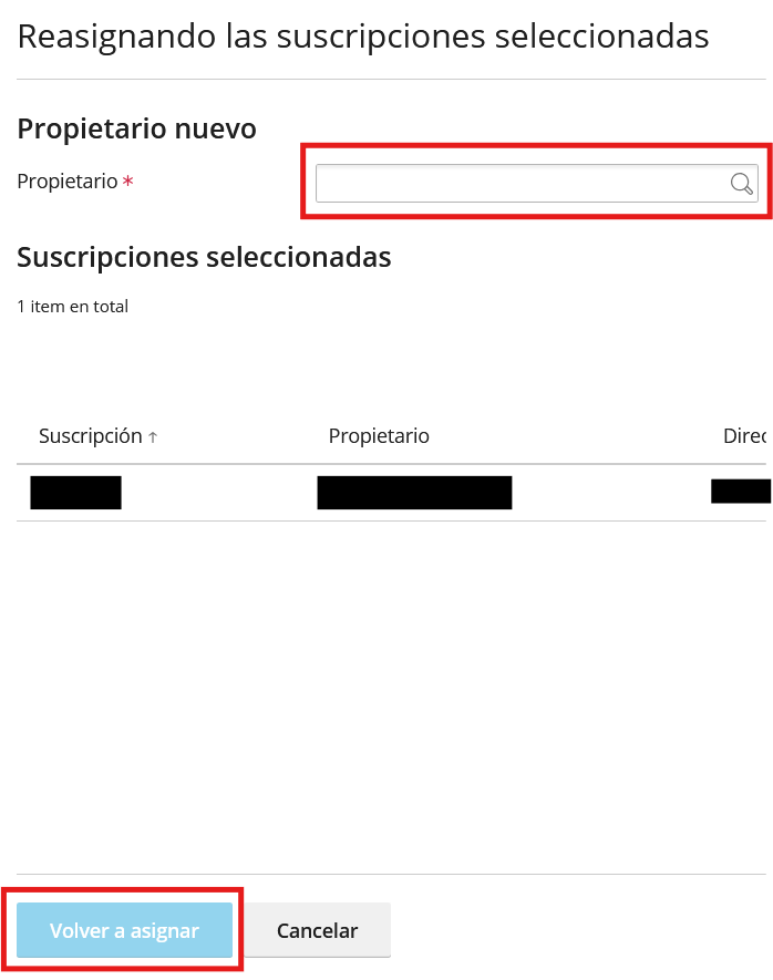 Una vez realizados los pasos anteriores, le aparecerá un buscador al lado del parámetro «Propietario». Busque al cliente que ha creado anteriormente y pulse sobre «Volver a Asignar».