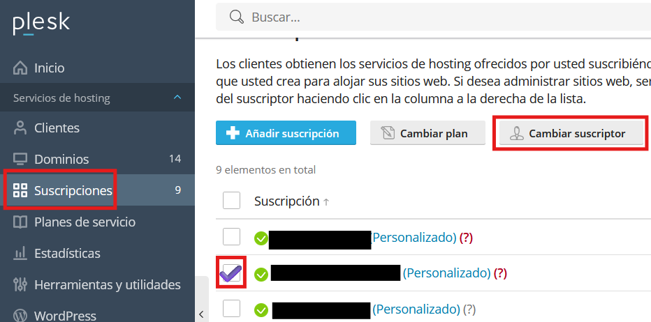 Pulse en la columna de la izquierda en Plesk, sobre «Suscripciones», seleccione la suscripción la que quiere modificar el suscriptor/cliente y pulse sobre «Cambiar suscriptor».