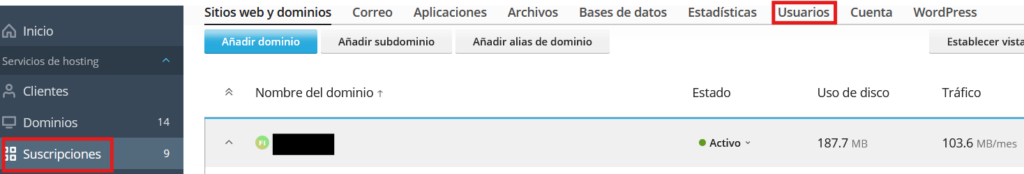 2. En la columna de la izquierda, pulse sobre «Suscripciones». Posteriormente, seleccione la suscripción a la que quiere crear el usuario y pulse sobre «Usuarios» en el apartado de arriba de la suscripción.