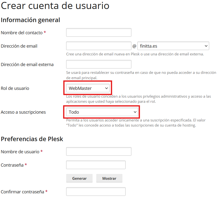 Nota: Cabe destacar que en el parámetro «Rol de usuario», es necesario añadir un rol u otro dependiendo de los permisos o privilegios que se le quieran añadir al nuevo usuario. Para el parámetro «Acceso a suscripciones», es posible vincular o dar acceso al usuario a todas las suscripciones o bien a suscripciones específicas que ya tenga creadas y que puede seleccionar en el menú desplegable.
